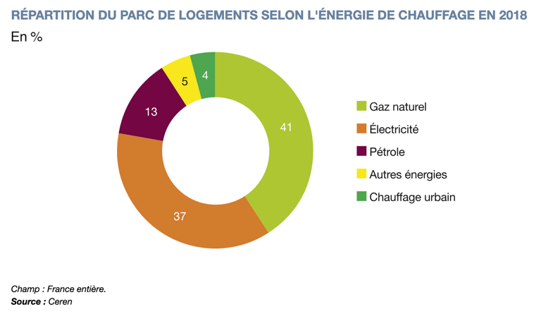 Pour information, le site DataLab du gouvernement est très bien fait. Pour les curieus.e.s, on y apprend notamment que "le parc des résidences principales de France métropolitaine est principalement chauffé au gaz naturel et à l'électricité (respectivement 11,9 millions et 10,6 millions de logements, soit 78 % du parc). Par ailleurs, 3,9 millions des logements sont chauffés par des dérivés du pétrole (fioul domestique, gaz de pétrole liquide), soit 13 %" (1er graphique). Inutile de dire que les énergies renouvelables ont encore un bel avenir devant elles.