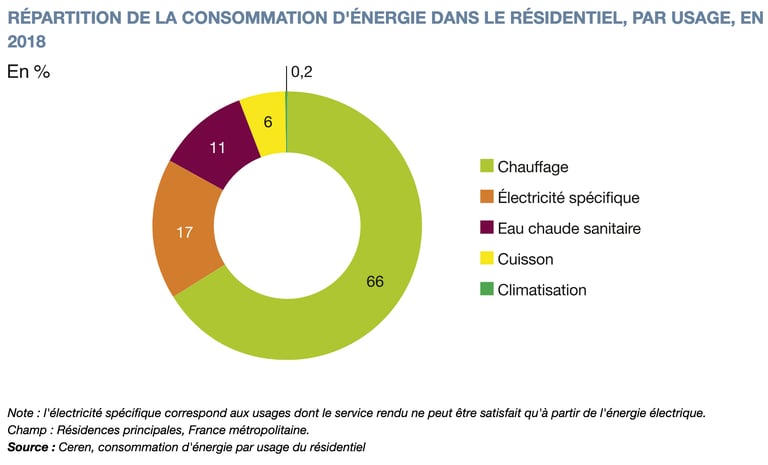 L'énergie consommée dans le résidentiel (appartement et maison) en 2018 est utilisée principalement pour le chauffage (282 térawattheures, soit 66 % de la consommation) et l'électricité (71 TWh, soit 17 %). Eau chaude et cuisson comptent respectivement pour 11 % (48 TWh) et 6 % (23 TWh). La climatisation représente une faible part de cette consommation (moins de 1 TWh). A noter que les maisons représente 57 % du parc des résidences principales, et sont à l'origine de 73 % de la consommation en chauffage, 68 % de celle en électricité et un peu plus de 60 % de celle employée pour l'eau chaude et la cuisson" (2ème graphique).